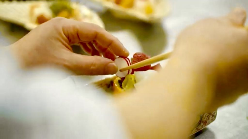 日本料理の考えや季節感、地元の食材そして人々のつながりを料理に組込み完成させる。